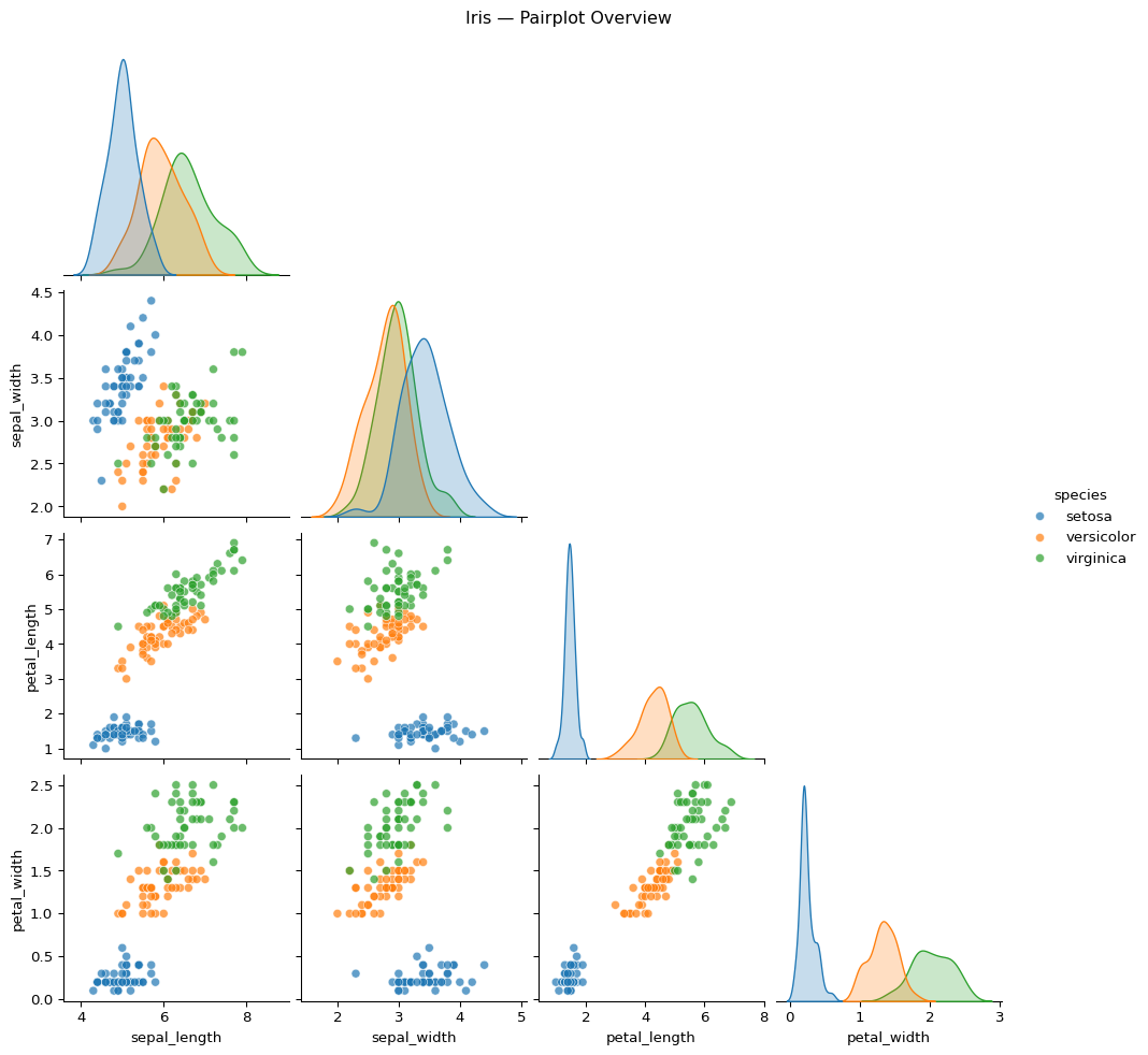 g.fig.suptitle("Iris — Pairplot Overview", y=1.02)