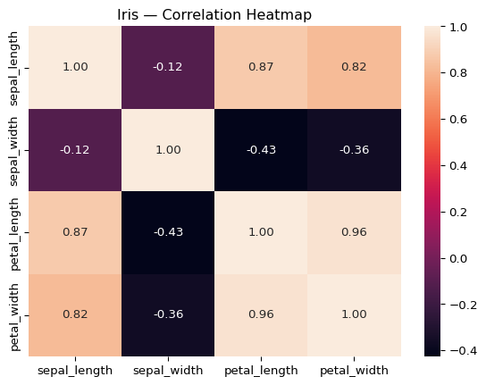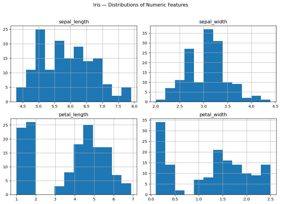 plt.suptitle("Iris — Distributions of Numeric Features", y=1.02)